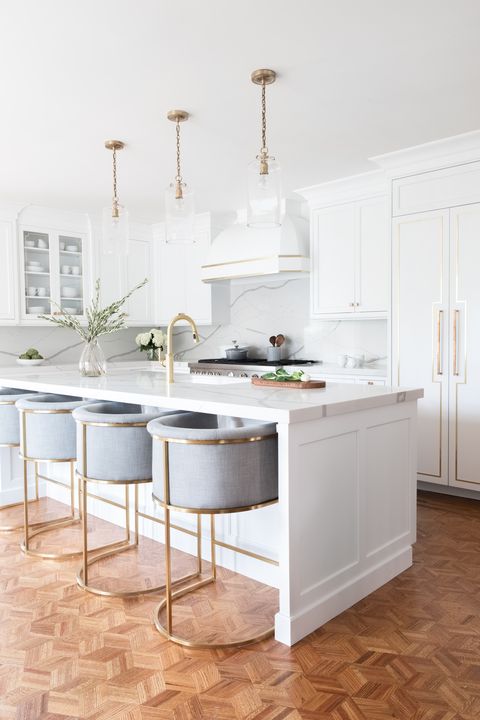 Any designer worth her trade discount will tell you that a good flow is the key to any well-loved space. Here, Kantrowitz ensured that both with floor plan and visual cues. “The family room is immediately adjacent to the large kitchen,” optimizing traffic between the two most-used parts of the house. Meanwhile, in the powder room down the hall, the designer explains: “I wanted the space to feel connected to the rest of the house, so instead of beginning the tile at the door frame, I decided to tie in the hardwood floor as a border surroundin the tile.”