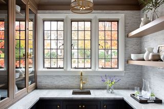 Meanwhile, in the butler’s pantry, glass-front cabinets make for storage that doubles as “an intentional accent,” explains Kantrowitz.
