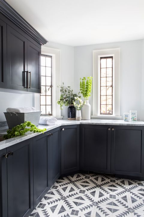 A dark navy on cabinets in the laundry room may come as a surprise, given that white and cream cabinets have become a go-to. But Kantrowitz is a fan of a little darkness. “I’ve been using black and really dark navy a lot lately, and I love it,” she says. “In just the right dose I think it’s so sophisticated and chic—if you do it in small doses it’s not overpowering.”
